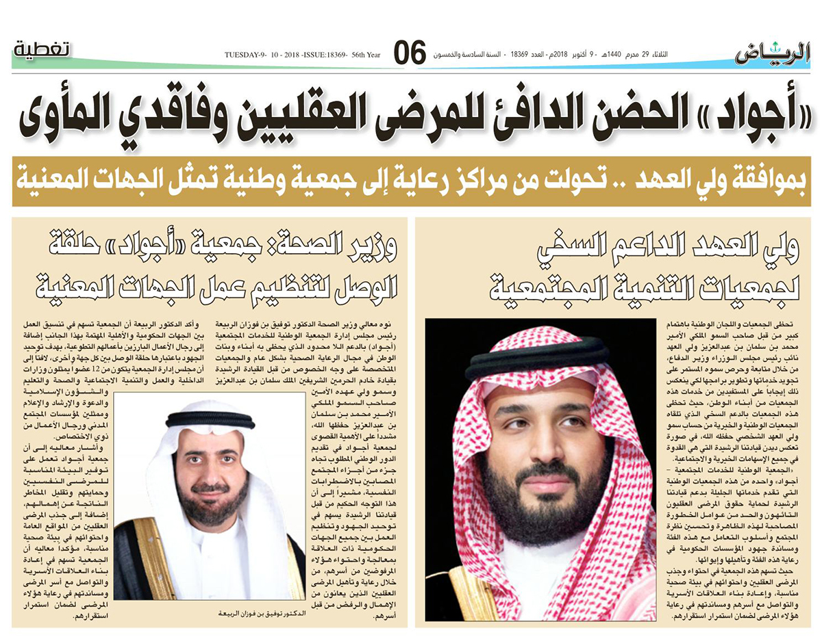 جريدة الرياض دشن وزير الصحة رئيس مجلس إدارة الجمعية الوطنية للخدمات المجتمعية «أجواد» د. توفيق الربيعة خدمة التبرُّع عن طريق رسائل الجوال بهدف دعم جهود الجمعية لتوفير البيئة المناسبة للمرضى العقليين التائهين وفاقدي المأوى ورعايتهم، وذلك تحت شعار #بجودك تجودأجواد....